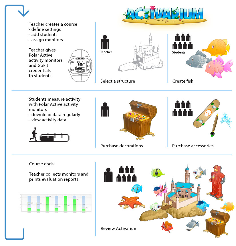 Le déroulement général de la surveillance d'activité sur le service Web Polar GoFit est décrit ci-dessous. Commencez par configurer le système. Puis, créez le premier cours et continuez tel qu'indiqué sur l'illustration ci-dessous.